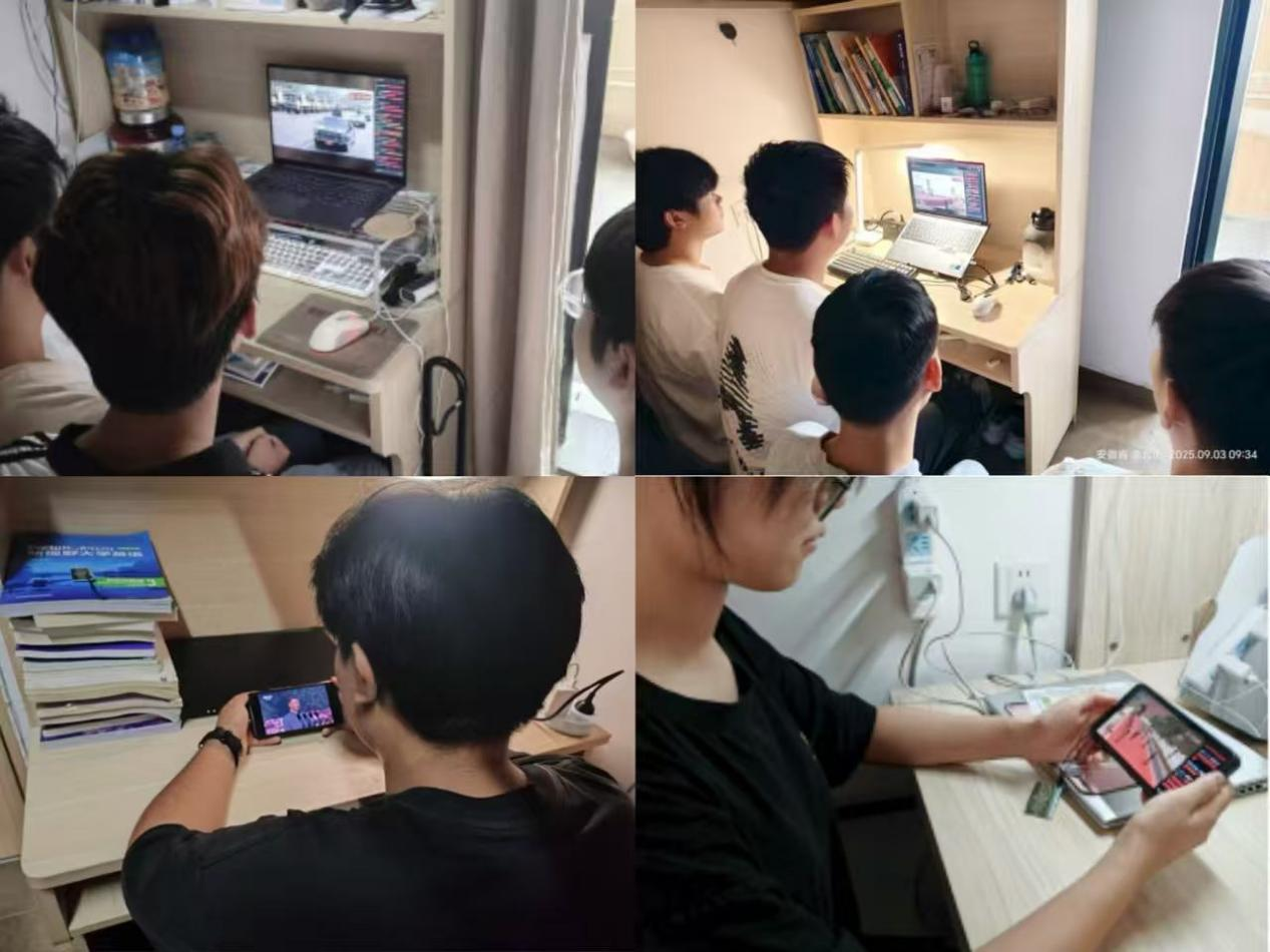 与此同时,材化学院的学生以宿舍为单位隔空同步感受祖国的强大。观看过程中,将士们铿锵有力的步伐、英姿飒爽的风采,以及一系列自主研发的高精尖武器装备,引得学生阵阵赞叹。